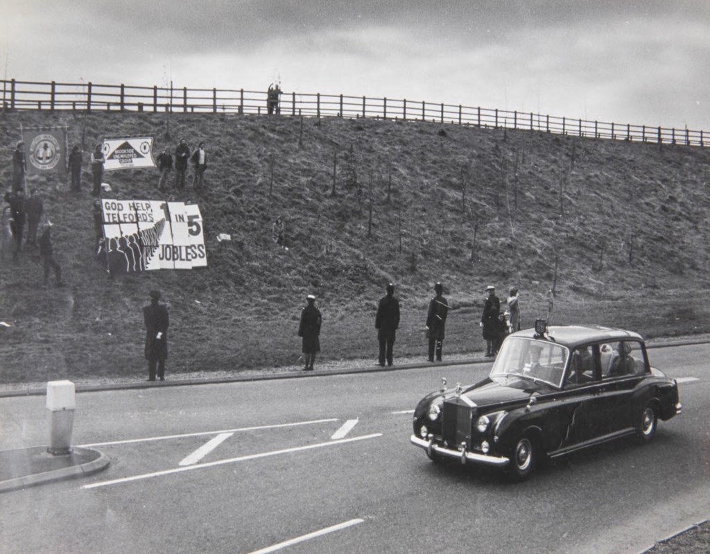 On a second whistle, the placards were reversed to reveal ‘God Save Telford’s 1 in 5 Jobless’.